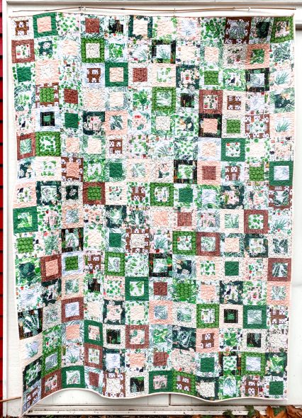 Anyway, in addition to becoming obsessed with gardening (and chickens!), I’ve also gotten into houseplants, and I have a bunch of them in my office. Seemed like a good theme to go with for this quilt, so I pulled a bunch of fabrics from my stash and ordered a big assortment as well, and then I started sewing on NYE 2022. I worked on this quilt slowly over the whole year and just finished it today, it’s currently in the washing machine waiting to go in the dryer.