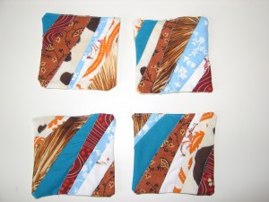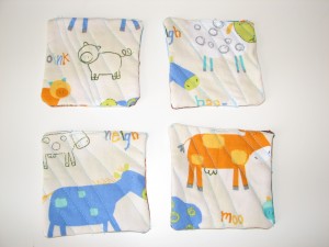 My very good friend Maggie, who is from Missouri, has a very cool Brooklyn walk-up. Her birthday is next week, and since she just moved in to this place last fall I wanted to make her something for the apartment. She is a Southerner who appreciates homemade gestures. Her walls are cream, and she has sky blue accents and pictures of red barns on the walls. Very natural, kind of funky for Brooklyn, all Maggie. I decided to make her some quilted coasters, and I bought 4 plastic iced tea tumblers from Target to go with them.