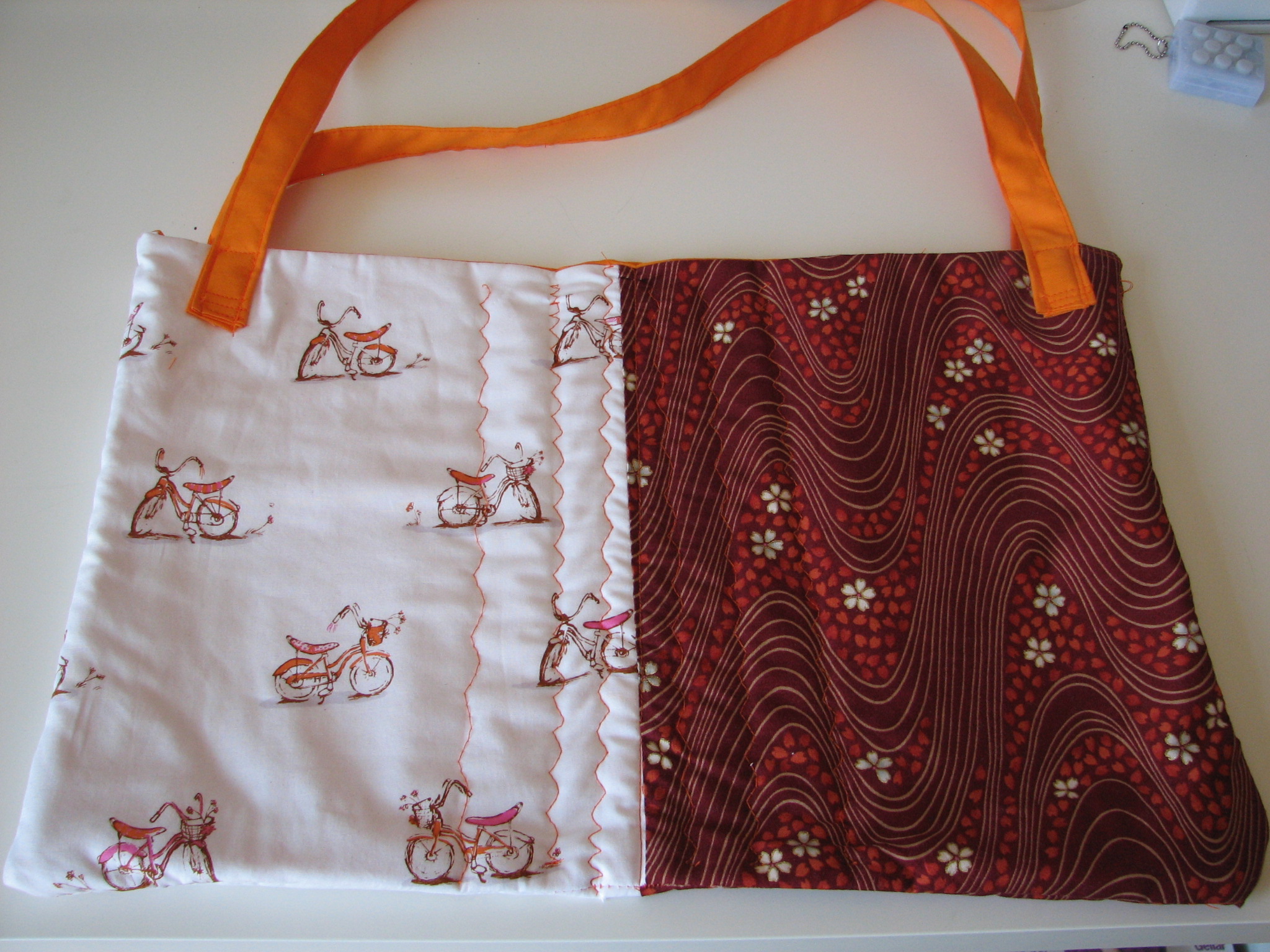 I picked one fabric to be my “red” and one to be my “white,” and then I used solid orange for the lining and the handles because it coordinated with the colors in my main fabrics. I’ve put the instructions for the actual project here, since they’re too lengthy for this post.