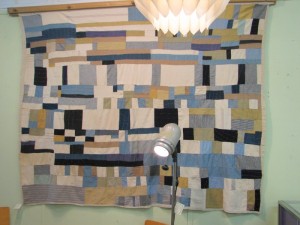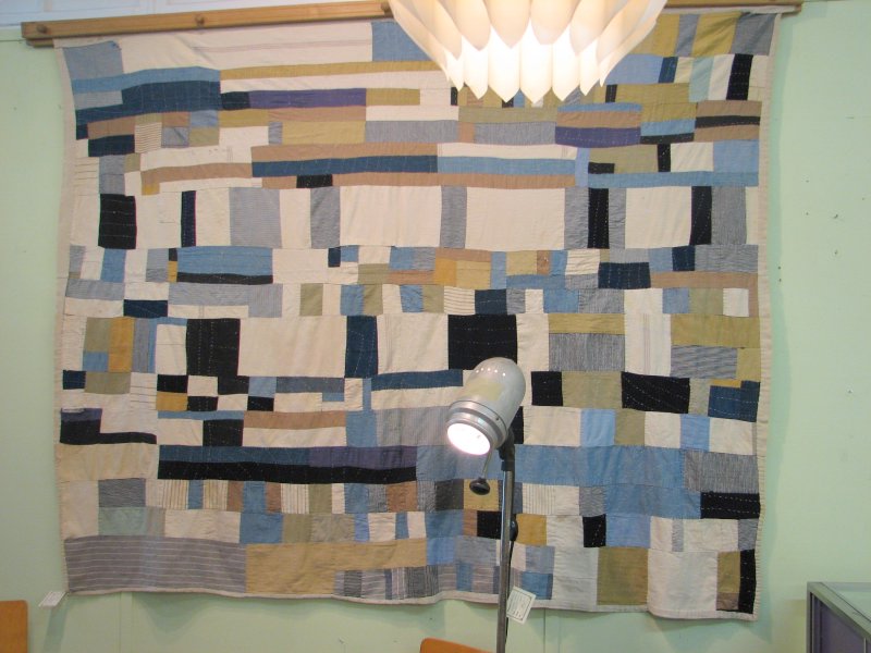 The antique store in Lambertville, NJ where I went book browsing had this on the wall. The store is called The People’s Store, and they were nice enough to let me take photos of this quilt. They were selling it for $875, so the photos are all that I brought home with me. I really like the design of this. I might try to do something like this one day, but it’s kind of an overwhelming idea. If I’m stressed out cutting the pieces for a fairly structured quilt, keeping track of this might make me lose my hair or something.