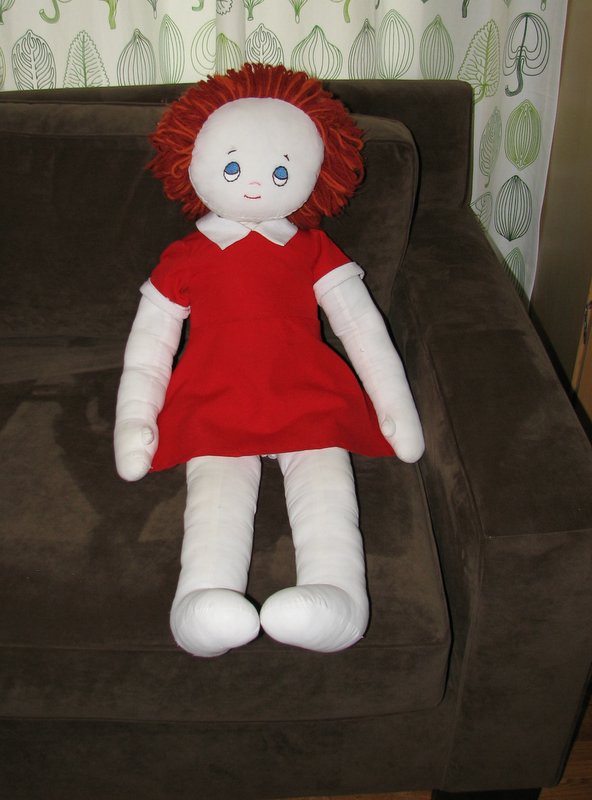 This is my Little Orphan Annie doll. My mother made this doll for me when I was two years old, right down to the signature dress and hand sewn two-tone yarn hair. Now, please note the size of this doll as she lounges in our library. At the age of two, this doll was almost twice my size. I think I learned to drive before I got taller than Annie. Plus, I was a bit of a tomboy as a kid, and with a few notable exceptions I liked playing with my older brother’s toys more than dolls. So I’m completely ashamed to admit this, but I didn’t give Annie the warmest reception when she was unveiled for my second birthday. I don’t know what I was expecting to get that year, but I actually do remember this giant doll being revealed to me and the confusion I felt. She was bigger than me, and I already had a beloved doll-Katie Sarah Watuna.