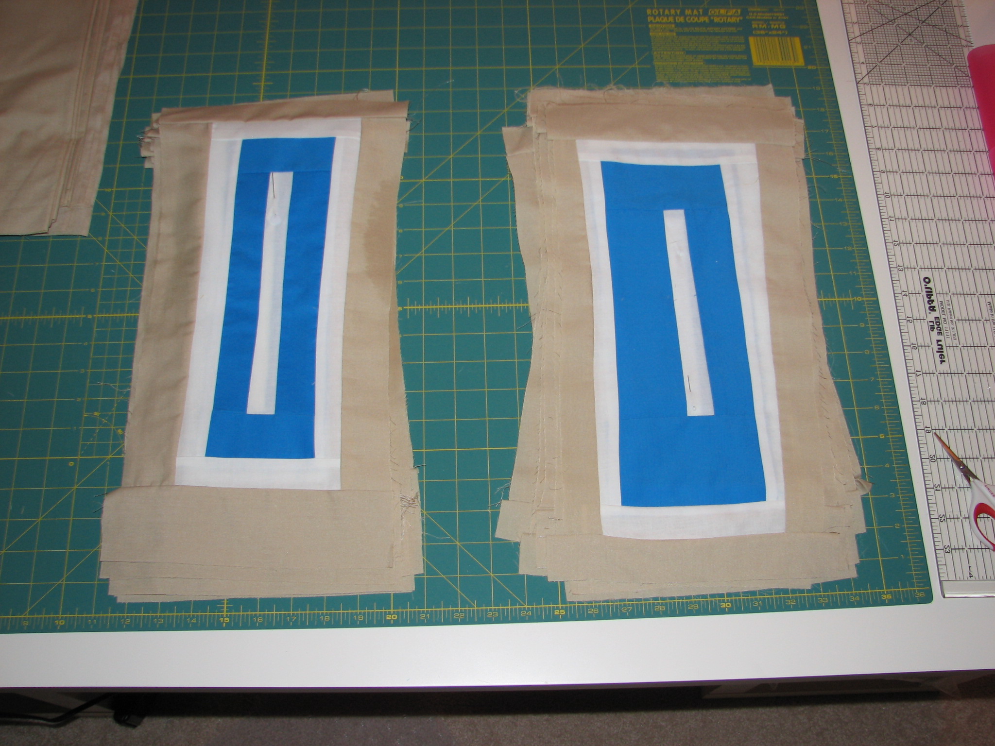 I’ve finally finished piecing the blocks for this quilt, but I’ve got concerns. First of all, the khaki fabric I used is much thinner than all the fabrics, so it’s more delicate. And for reasons I have yet to work out, I lost a lot of overall dimensions when I sewed the blocks together. They didn’t sew together flush, which I was expecting. Once I square all of these up so that they’re even, I’m estimating that this will be a good 7″ narrower than I originally thought. The length is pretty right on, but the width isn’t the same as the book suggests. This isn’t the end of the world, but I may have to figure out how to make up that shortage. I really don’t want to add another row of blocks because I’m sort of over log cabin piecing at the moment. Maybe another layer of border or something, we’ll see.