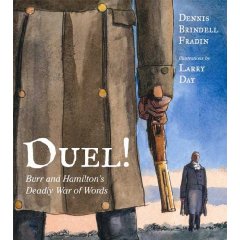 I thought Duel! was an accessible nonfiction offering about the pistol match that killed Alexander Hamilton. Older elementary grades will appreciate it, and possibly even some middle schoolers. The illustrations are dramatic (I love that front cover, but at least one of my coworkers hates it), and the story of the feud between Aaron Burr and Alexander Hamilton is explained in interesting parallels and contrasts. Their childhoods are described side-by-side, as are their experiences in battle. I thought this would be great for Social Studies lessons and school history projects. There is a lot of text on the pages, but it isn’t boring or overwhelming. And kids will think the duel aspect is cool. Plus it’s a nugget of New Jersey history that doesn’t get much press in the classroom.