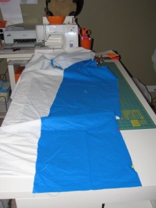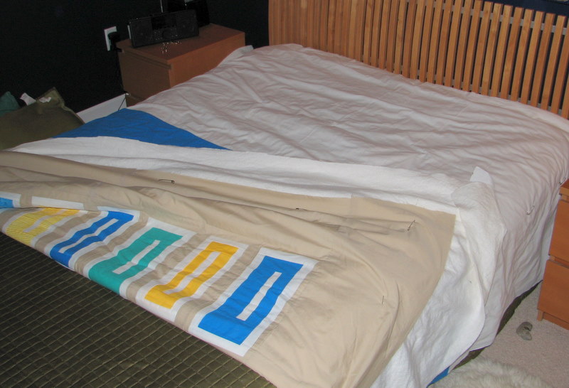 This means that I had to make a whole new quilt back, as I was just using a giant piece of white fabric cut to the edges of the quilt top. I didn’t want to make a back. So I put it off for weeks and weeks, and this weekend I finally decided to just get it done. All I did was split the white fabric in half (I did leave some length on the left and right edges, but not the top and bottom) and sew a section of the blue fabric between them. Easy as pie, took an hour or so to do. So now the whole thing is pinned back together and is REALLY ready to go off and be quilted. I’m dropping it off some time this week, I have to move on to something else!
