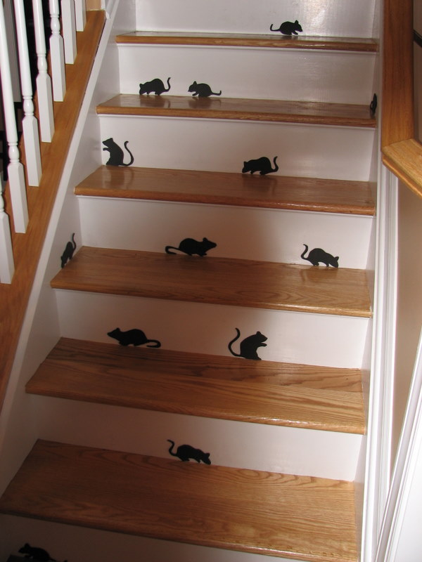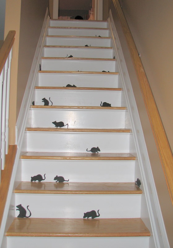 I’m actually having fun decorating for Halloween. Maybe it’s the house part, as opposed to an apartment? I don’t think so because my mom went all out for every holiday-Morley the Ghost was hung from the tree outside our apartment every year, and I loved him. So maybe it’s just me turning into more and more of a domestic goddess with every passing second. This afternoon I watched the remake of Prom Night (okay, I do love terrible horror movies at Halloween-that’s one good thing going for it) and made these Martha Stewart mice I mentioned a few days ago. Hers called for construction paper, but I read some of the comments on that page and got the idea to make mine out of craft foam so I can reuse them year after year.