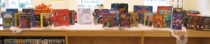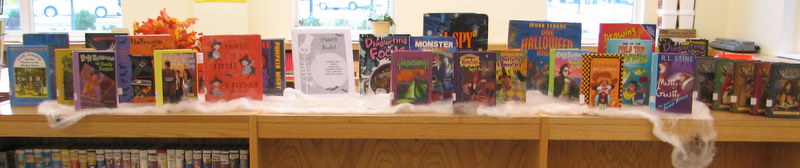 This is my book display for Halloween. I’m still working on that whole bookcase, which is empty and the first shelves you see coming in the door. Michael’s was having a big sale on Halloween stuff, and I had coupons! So I got some other festive Halloweeney things for the library.