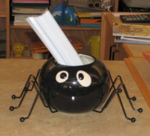 I also got this guy for the circulation desk. He came from JoAnn Fabrics, and I had to have him. So he is now my Halloween holder for shelf markers. I like him so much I may keep him out all year.