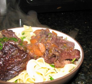 Ted Allen’s book had a recipe for red wine braised short ribs that sounded really easy and delicious. It was easy, but I found my first problem with his book. In his attempt to sound really casual, like throwing together a gourmet meal is as easy as tying your shoes, his instructions left out some useful tidbits that a rookie like me could have used. The meat was tender and perfectly cooked, but the whole dish was rather greasy and underseasoned. And I seasoned heavily when the instructions told me to, but it still needed more. And had I ever made a short rib before, maybe I would have thought to do something like trim the fat. I just browned those bad boys and let the wine do the rest. His instructions for serving were also a little vague, they just said to serve it on some buttered egg noodles. Serve it how? Does it get sliced? Or shredded? Or do you just plop those short ribs on top as is? These are extra details I really could have used, since the idea of his book is that people who aren’t proficient chefs can make good food without a lot of stress.