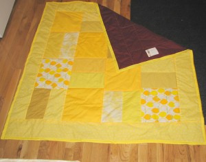 The finished blanket is 53″ x 55″, and I used a solid burgundy fabric for the backing. I also used a low loft batting. I wanted it to be soft, but not fluffy like a comforter. For the actual quilting I just stitched in the ditch with yellow thread, which looks very cool on the dark background and saved me time maneuvering the quilt into a more elaborate pattern. I am still a relative novice, so there is some puckering near the quilted seams. This is the biggest thing I have ever machine quilted, so I had a few growing pains. But I think it gives it a certain charm, and I know that A likes things that have character.