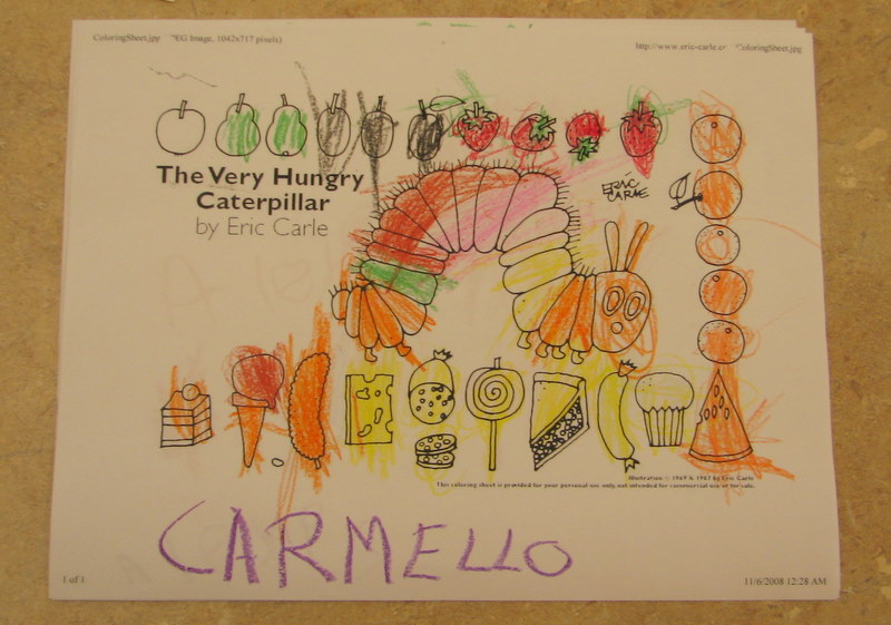 Once we’d read the stories, the kids worked on Very Hungry Caterpillar coloring sheets that I hung up all over the front of my circulation desk (which I’ve turned into my student work gallery).