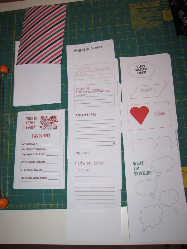 Then I was trying to figure out what to make for Adam’s 11-year-old niece, Cleo. Fortunately I spend a lot of time around the preteen set, and I remember the kind of stuff I loved at that age. Ideas collided and I decided to make Cleo her own personalized diary. I’d bought a giant book of Christmas themed scrapbook paper a few weeks ago, even though I don’t scrapbook and had no idea what I would do with it. The papers were just so cool, and many would work outside the holidays. I had cardstock lying around and plenty of ink in my printer.