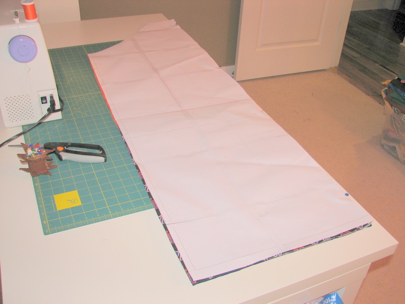 The template is confusing because it prints out onto several pieces of regular paper. You have to cut it out, line up all the numbers, and tape it together. It’s basically one extra long apron piece folded in half, so I folded all my fabrics in half lengthwise to cut out the apron. Then you open up the pieces and pin them together. Following the directions and the markings on the pattern, I folded the bottom of the apron up to create the pocket. I pinned it and marked the pocket into thirds. Then I sewed those lines.