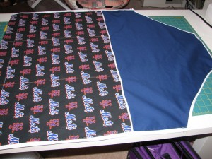 It took a little maneuvering to line up the Mets fabric so it would look pretty straight on the apron front, but then I sewed it to the orange fabric to make it one back piece. Then I took a 2-yard piece of navy blue fabric for the front. I laid them down on top of each other wrong sides facing (which was really only important here for the Mets fabric) and cut out the pattern using Martha’s template.