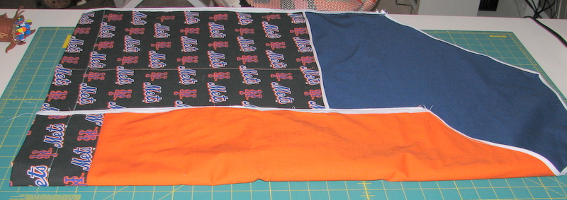 I’ve tweaked Martha’s pattern because it’s a little oversimplified. The comments for this apron don’t think it’s very clearly explained, and I remember it took me a while to figure it out originally. I use two fabrics wrong sides together-one for the back and one for the front. So when you fold up the fabric to make the pockets you see the back fabric. But because I only had 3/4 of a yard Mets fabric I also used bright orange for the back of the apron to finish it.