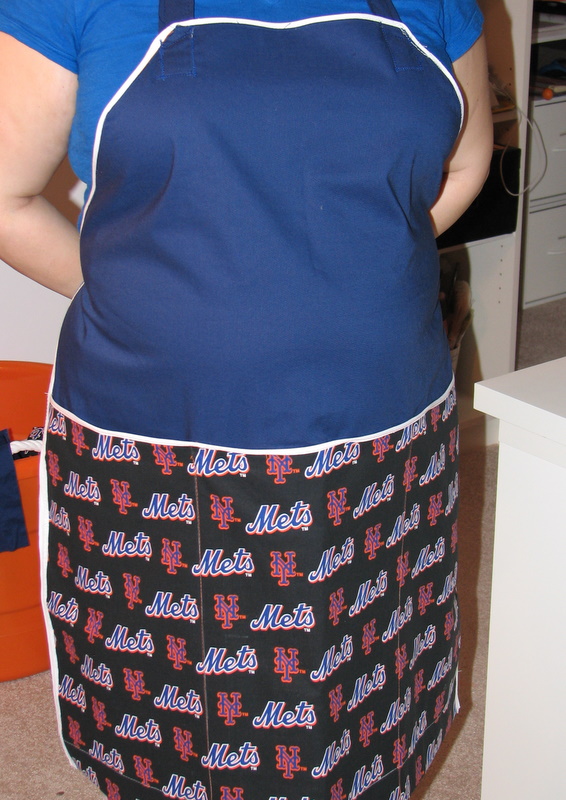 Okay, back to the original post. One of the gifts I made this year and had to keep secret on this blog was a Mets apron for my friend Elizabeth. But I delivered it to her the other day, so now I can post about it. She is a rabid Mets fan and is also learning to cook, so I made an apron using the same Martha pattern. And I’ve made other aprons this holiday season with it that I will post about in the next few days.
