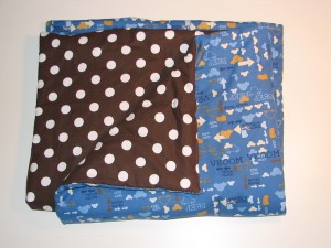 India registered for some cool baby boy goodies, including a brown chenille blanket with white polka dots. I had that exact fabric in my stash already (from JoAnn), so I put it on the back of this great “Beep! Beep!” fabric from Hoffman. I am obsessed with that car fabric, I bought the blue and brown colorways last summer and have been waiting for the perfect project to cut into it.