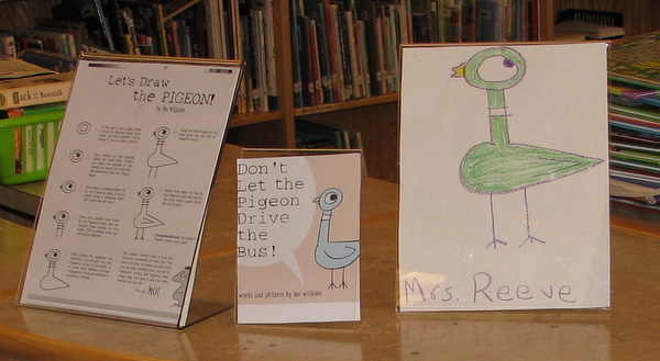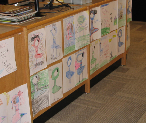 pigeongalleryI did the “Learn to Draw the Pigeon” activity with themĀ like I didĀ back at the public library, and that was a HUGE hit. I drew a pigeon first with each class so they could see how to do it, and they took their How To sheets home with them. They made all kinds of great variations on the pigeon, as kids do.