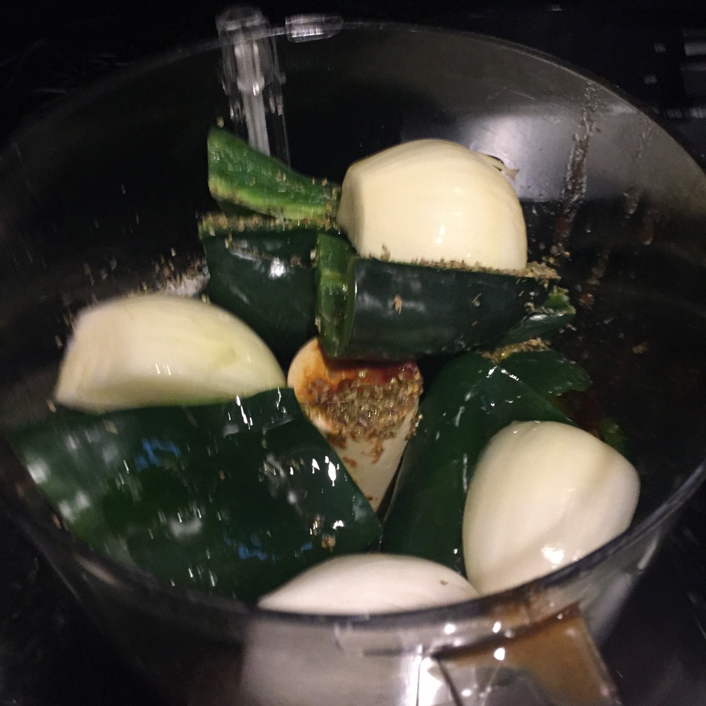 1. Put the poblanos and garlic in a bowl and microwave on high until “soft and pliable,” 2-3 minutes. Stem and seed the chiles. Put the chiles and garlic in a blender. Add the chipotles, onion, 2 tablespoons olive oil, honey, vinegar, 1 tablespoon salt, oregano, and chipotle seasoning to the blender. Puree until smooth.