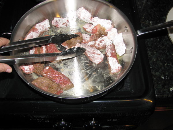 Trim excess fat, then thinly slice steak. Toss with flour, 3/4 tsp salt, and 1/2 tsp pepper.