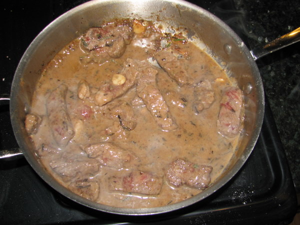 Heat 1 1/2 Tbsp oil in a 12-inch heavy skillet over medium-high heat. Sauté steak in 2 or 3 batches until no longer pink on the outside, about 2 minutes per batch, adding 1 1/2 Tbsp more oil as needed. Transfer to a plate.
