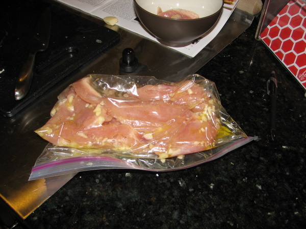 1. Adjust an oven rack to the middle position and heat oven to 200 degrees (I didn’t need to do this for 2 people). Combine the minced garlic, 3 tablespoons of the oil, and the cutlets in a zipper-lock bag and refrigerate while preparing the remaining ingredients.