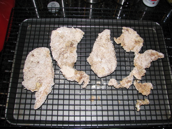 **As usual, I halved everything for 2 people. I actually sliced 2 boneless skinless chicken breasts in half horizontally, so I had 3 good cutlets and pieces of a 4th from a not-so-excellent slicing job. It was more than enough.