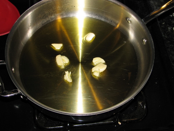 3. Heat 1/2 cup of the oil and 3 of the smashed garlic cloves in a large nonstick skillet over medium heat until the garlic is lightly browned, about 4 minutes. (Heat the oil and the garlic together, don’t add the garlic after the oil is hot).