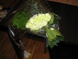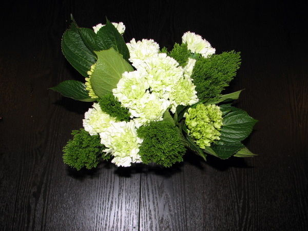 My version of a St. Patty’s Day celebration is this floral arrangement and an attempt at Shepherd’s Pie for dinner later tonight. I bought these green carnations, mini hydrangeas, and those leafy green numbers on the left that start with a “T” I think. And I actually made my own arrangement. I like it.