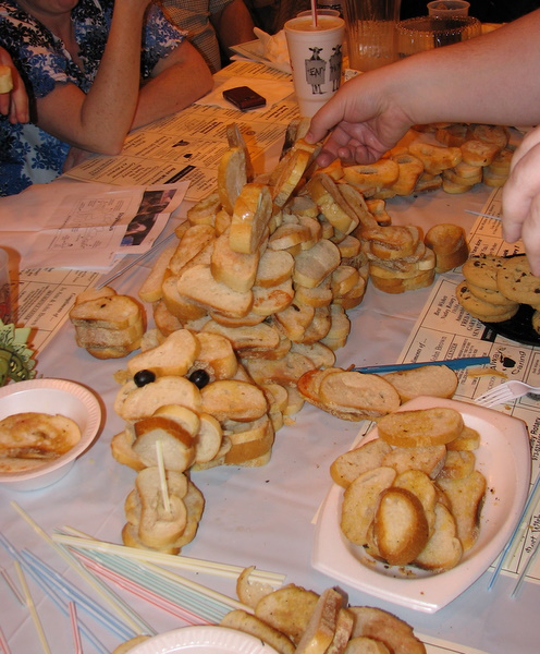 Those who are truly dedicated to the evening don’t eat the bread from their dinner. They pile it up and create elaborate bread sculptures on their tables (as we do every year). This photo is of the Stegasaurus our group made, which of course won! It’s our first win for the bread building competition, last year we were disqualified!