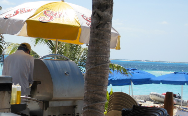 So we had a late start this morning while we sorted out the bank stuff, but once we got going it was a great day. We took the ferry from Puerto Juarez to Isla Mujeres (that’s the view from the ferry in the first photo). It took about an hour to get to the Isla from our hotel, but it was worth it. Everything is cheaper, more laid back, more bohemian. We had lunch at a great beach bar called Sunset Grill, complete with swings for barstools and a guy grilling on a backyard grill steps from the beach. The restaurants on the beach all have their own chairs and umbrellas on the sand that you can rent for the day. If you eat at the restaurant they deduct the $200 peso rental fee from your food bill. It was the cheapest meal we’d had on this trip so far until dinner tonight. We went to a little Italian place with high recommendations. Run by an actual man from Italy (there are tons of ex-pats on this tiny island), I had a giant bowl of hit-the-spot awesome spaghetti bolognese for about $5 USD.