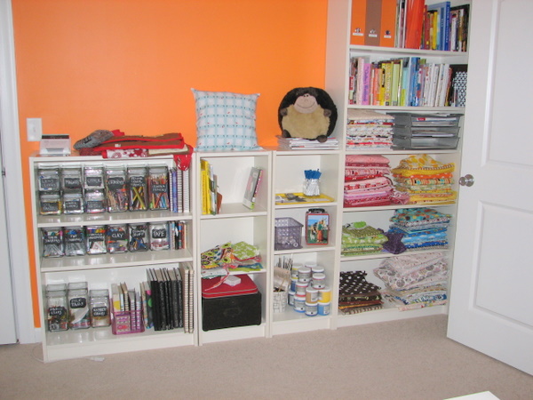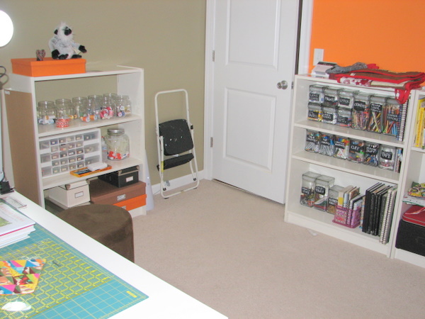 This is the orange wall that gives the blog its name. That’s not my whole fabric stash, just whole yardage of any prints. Those glass containers are a coup that I found on sale at K-Mart when we first moved in here. They were on clearance, so I could only get so many, but they’re perfect. Then I found blank ones at The Container Store and bought chalkboard paint and made some more of my own. Drawing supplies, clay, and office stuff live in those. I’m nearly out of room on my book shelves (for crafts and theory only, all others are in our library).