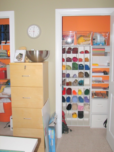 I have two closets in my studio, and the insides are painted orange, too. The rest of the room is that khaki color on the walls. The right closet is for yarn, fabric scraps, paper goods, and tools. The left closet is where I keep fat quarters, batting, solid fabrics, and binders. My camera is just about dead, so I didn’t get a decent photo of the left closet. That filing cabinet in the middle has patterns, articles, party notes, and resources from grad school and library life.