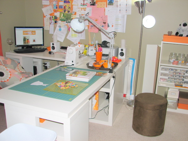 And last but not least, the desk. This was the design feature I most insisted on when plotting out this room (I made endless blueprints to decide where I wanted things). The long desk against the wall holds the computer, the printer, the office supplies, and my planner and sketchbooks. The short, fat desk is my cutting table. The sewing machine and self-healing mat live here, along with baskets full of pins, bobbins, and other stuff. Can you spot RPM Turtle’s new home?