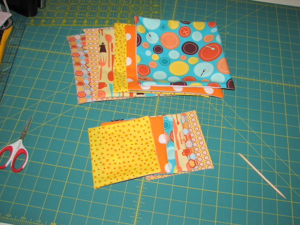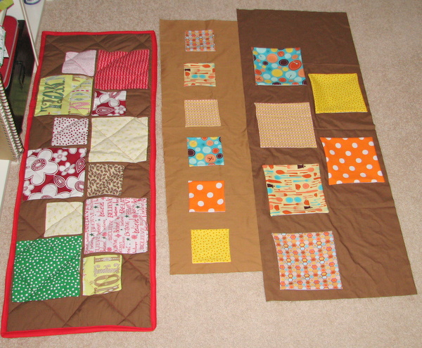 This picture of the current project laid out next to the Christmas Runner isn’t that great. But it gives you the idea of the colors. The dark fabric makes the patches pop more, but I don’t know yet if I’ll get bored with it. The caramel background just isn’t quite contrasted enough, but I still like the idea of a lighter fabric for something that will live on the table year-round. I think I’ll sleep on it and decide which I like better.