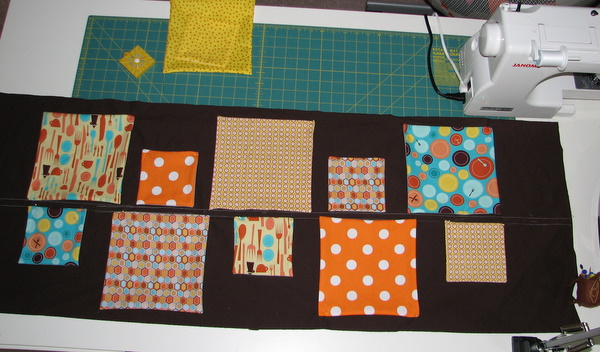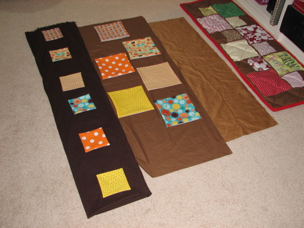 So lots of changes to this project over the past few days. First of all, I went to the fabric store to get some more solid brown fabric for the back. I ended up buying an even darker brown than the 2 I was originally choosing between. And I love it, the patches stand out perfectly against it. The Christmas Runner uses the middle brown, the only thing is that the brown I chose is close to the color of our dining room table. I’ll have to pick a good binding color to separate the two so the runner doesn’t disappear on the table.