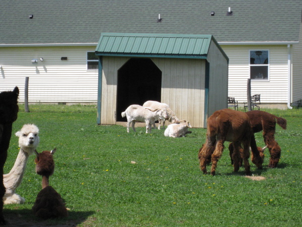 Freshly shorn alpacas and goats. Some of the alpacas did not look pleased.