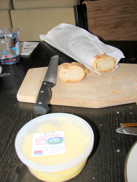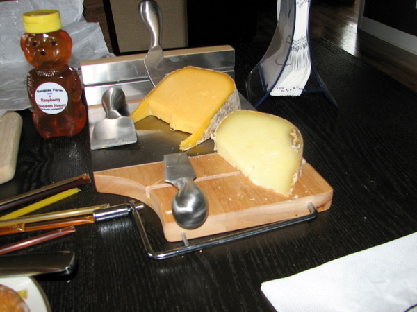 Oh, the cheese. We came home and had a feast of fresh baguette they were selling along with a couple of their cheeses. The orange one is California Tomme, and the lighter one is their classic Oldwick Shepherd cheese. We’re getting ready to finish them off for lunch today. That honey from Douglas Farms is also excellent, I bought a handful of honey sticks in different flavors to try them out. We bought raspberry, but the apple and clover are also great.