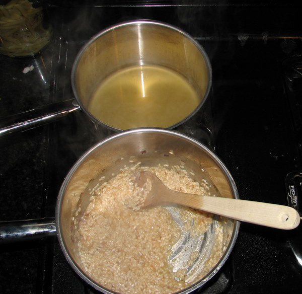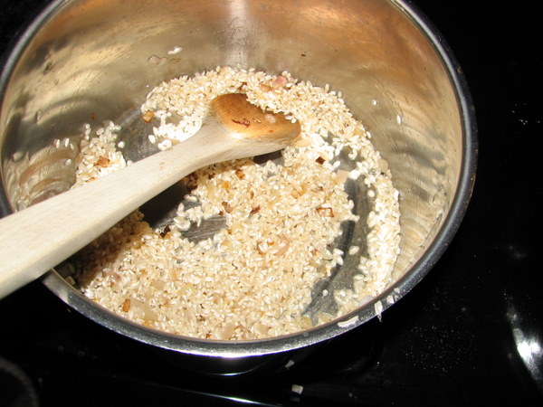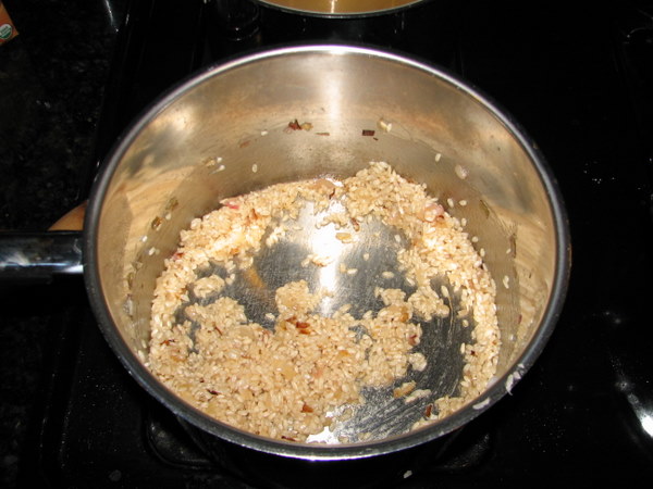 In another heavy, medium saucepan melt 2 tablespoons of the butter on medium heat. Add the shallots and cook until soft but not brown, 3 minutes. Add the rice and stir to coat.