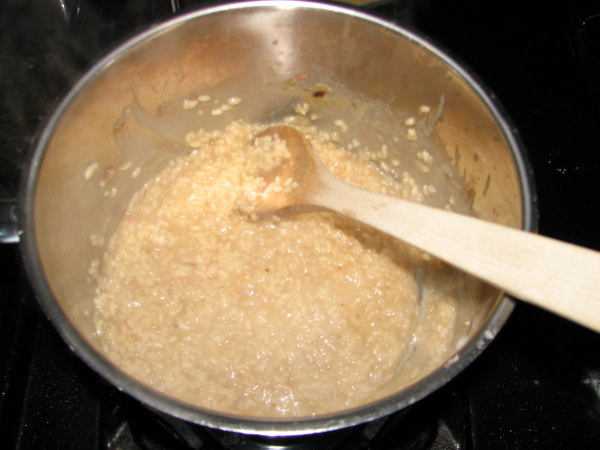 Keep cooking the rice, adding 1/2 cup of the broth at a time, stirring constantly and allowing each batch of broth to absorb almost completely before adding more. Do this until the rice is creamy and tender but still firm to the bite, about 20 minutes.