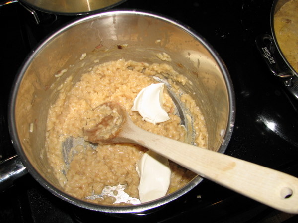 Remove the heat and add 1/2 cup of the Parmesan, the remaining butter, salt and pepper, lemon zest, and the mascarpone.