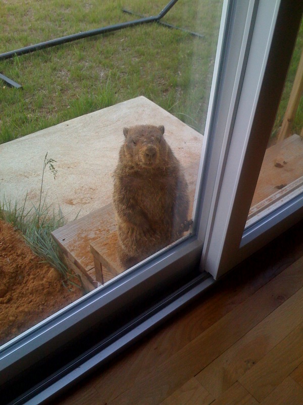 This cute guy lives under those stairs in our backyard. He’s been digging a bigger and bigger whole since spring started (and making a huge dirt pile). Now we’ve found his other hole, a “back door” by our air conditioner unit near the side of the house. And we see a groundhog (possibly him, possibly not) going under the shed in the yard behind ours. He’s building an empire under our yard, so Adam decided today he has got to go. Any suggestions?