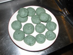 This is when things got interesting. I’d added a little black, but when I couldn’t get to navy blue I threw in a little yellow to try and get to green. No idea why I did this, but I ended up with delicious cookies in a very alien color.