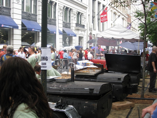 Oh yes, it poured. Just as we were finishing up and thinking about maybe 1 more plate of pulled pork from The Pit, it came down like crazy. And I forgot my raincoat. I was soggy, but I was happy. We managed to grab a t-shirt for Adam and a bunch of sauces and rubs from various pits before making a mad dash for the car.