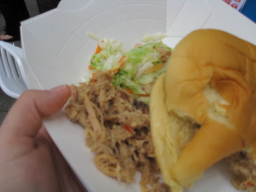 So we got to try Ed Mitchell’s pulled pork, which was hands-down the best pulled pork either of us have ever had. Neither of us like coldslaw, but we absolutely loved his. So fresh and crunchy. And the pork wasn’t covered in sauce, but it was marinated in a heavenly vinegar mixture. There was lots of nodding and ecstatic eye-rolling while we ate.