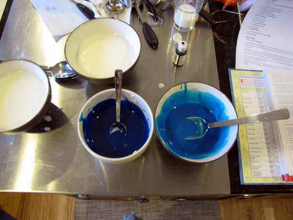 My food coloring works. I finally got a nice navy blue color, and I also managed a nice aqua (which isn’t pictured here, just my stages of blue).