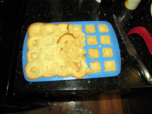 I made little cakes with my snazzy new square shaped silicone pans that I found at AC Moore over the weekend. ButI don’t like the yellow cake I made. I used pastry flour (the recipe called for cake flour), but it made the cake really grainy. It was more like cornbread than yellow cake. But the pans work!