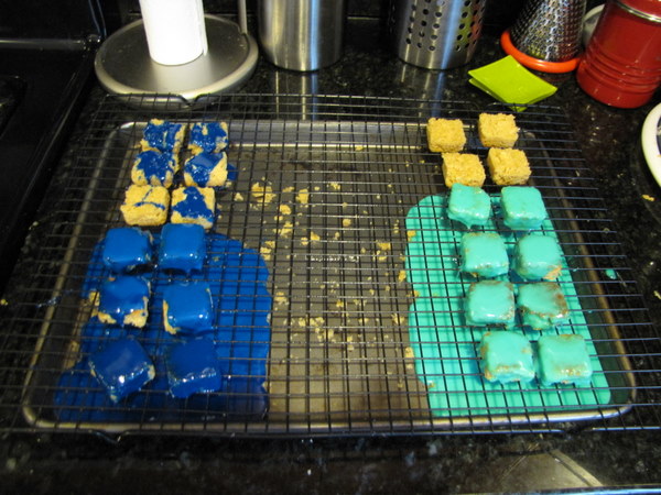 My whole enrobed with icing plan officially doesn’t work. It’s not thick enough, and if I make it any thicker I will OD on the sugar. This was apparently a fondant recipe, but it seems more like royal icing. I’m clearly no baking expert, but I thought there was a difference. I knew this wouldn’t be thick sheets like those molded onto cake, but I thought it would be thick and velvety, and I thought it would pour and cover nicely. It didn’t really work. So I will be melting white chocolate and coloring that instead. That’s the next experiment.