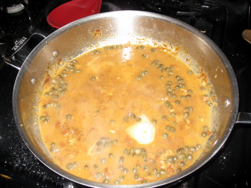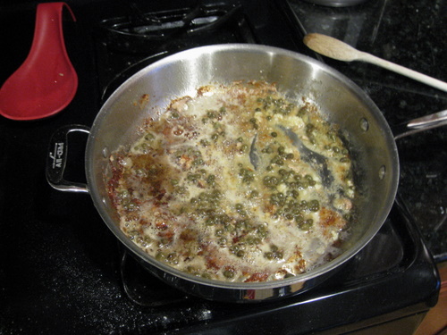 Melt another tablespoon of butter in empty skillet. Add capers, garlic, and the reserved flour and cook about 30 seconds, until fragrant. Add broth and wine and simmer until reduced to about 1/2 cup, 8-10 minutes.
