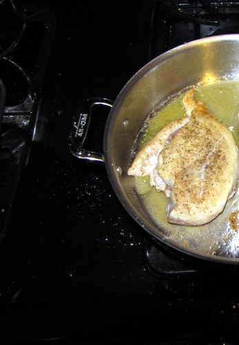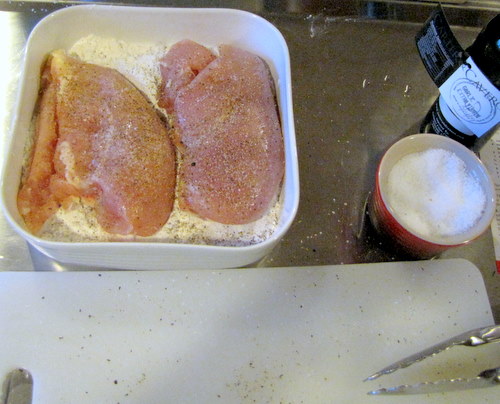 Spread flour in a shallow dish. Pat chicken dry with paper towels and season with salt & pepper. Dredge chicken in flour, shaking off excess.
