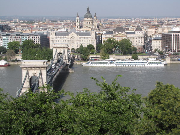 It took about 13.5 hours total, but we made it to Budapest. The city is beautiful, and incredibly hot. Upper 80s into the low 90s today. It was mid-afternoon by the time we arrived at our hotel, Sofitel. So we cleaned up, did a little sightseeing, and then came back to lay around in the air conditioning. And to eat dinner in the hotel restaurant, which is actually kind of wonderful. I don’t always like hotel restaurants, but this one is really fun.